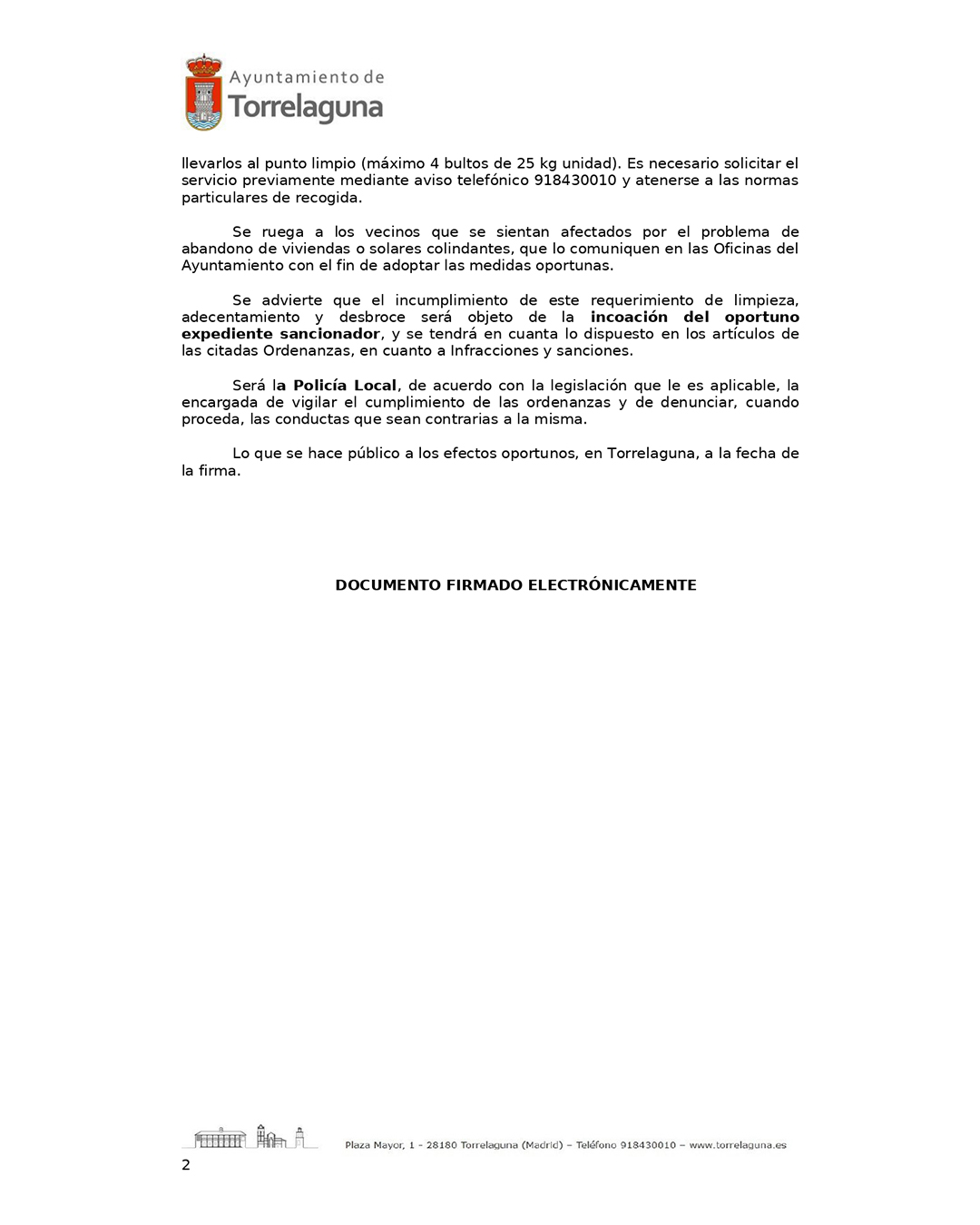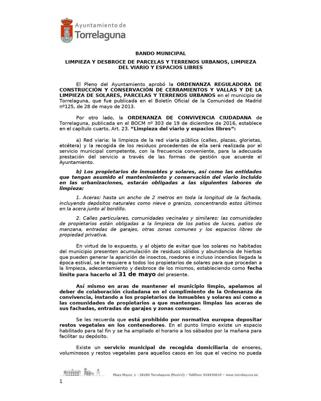 Desde el Ayuntamiento de Torrelaguna recordamos a todos los propietarios de solares y terrenos urbanos que, conforme a lo establecido en nuestra Ordenanza Reguladora de Construcción y Conservación de Cerramientos y Vallas y de Limpieza de Solares, así como en la Ordenanza de Convivencia Ciudadana, deben proceder a la limpieza, adecentamiento y desbroce de sus parcelas antes del 31 de mayo de 2025.