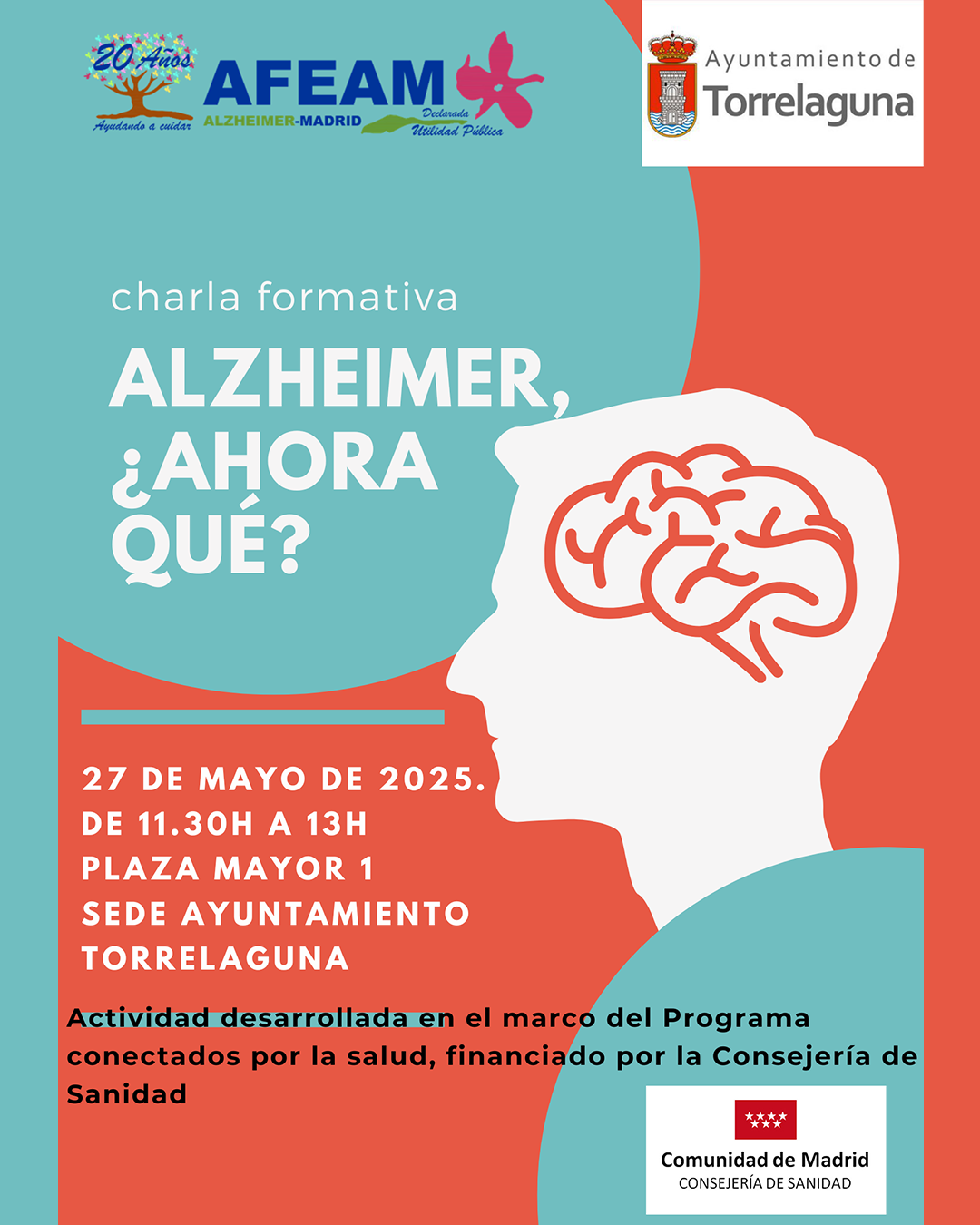 La charla está organizada por AFEAM (Asociación de Familiares de Enfermos de Alzheimer de Madrid), en colaboración con el Ayuntamiento de Torrelaguna, y se enmarca dentro del programa “Conectados por la salud”, financiado por la Consejería de Sanidad de la Comunidad de Madrid.