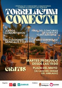 El próximo martes 29 de julio a las 19:00 h, la Plaza del Mayo acogerá la fiesta de clausura del Campo de Voluntariado “Arte Comunitario contra la Soledad No Deseada”, una iniciativa impulsada por Asociación Garaje y la Dirección General de Juventud de la Comunidad de Madrid, en colaboración con el Ayuntamiento de Torrelaguna.