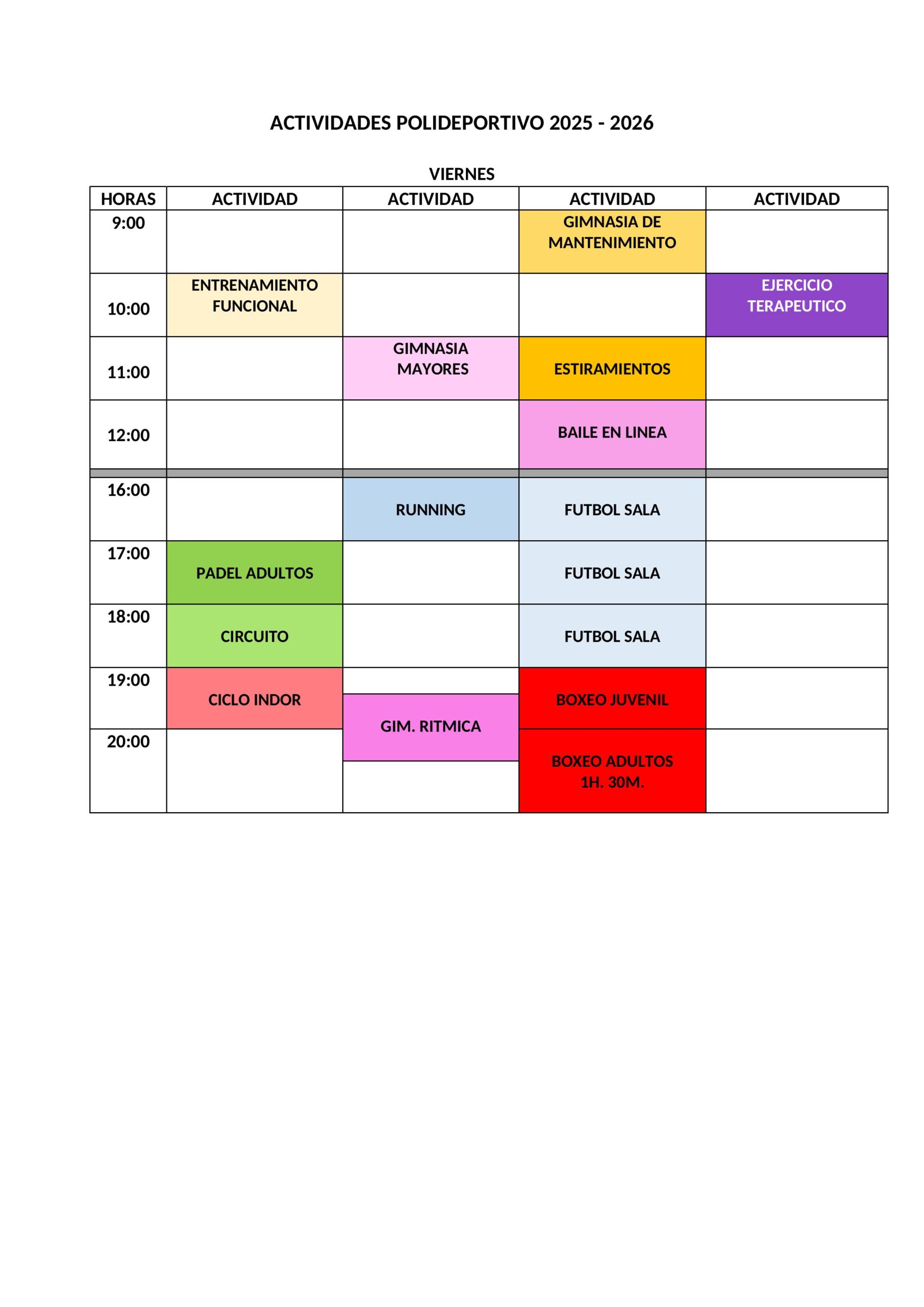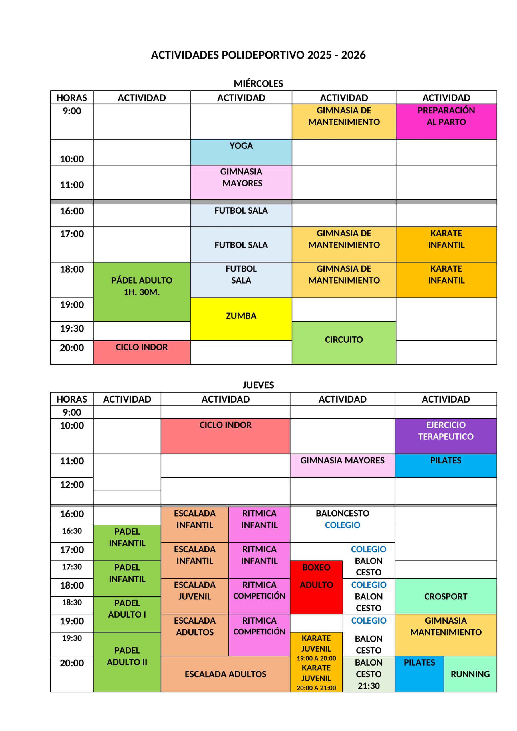 *Excepto clases de escalada: martes y jueves de 16:00 a 20:00 h y clases de fútbol: lunes, miércoles y viernes de 16:00 a 19:00 h.
