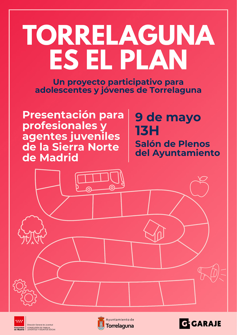 El próximo viernes, 9 de mayo, a las 13 horas, el Salón de Plenos del Ayuntamiento de Torrelaguna acogerá la presentación del proyecto «Torrelaguna es el Plan», una iniciativa participativa dirigida a adolescentes y jóvenes del municipio.