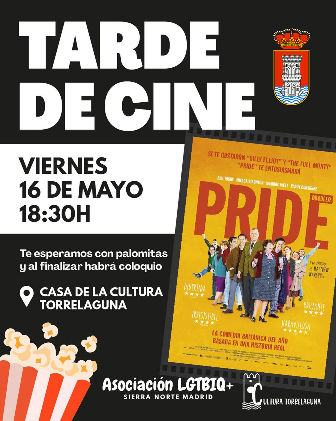 La Casa de la Cultura de Torrelaguna acogerá este próximo viernes, 16 de mayo, a las 18:30 h, la proyección de la aclamada película Pride, dentro de una nueva jornada de cine organizada por la Asociación LGTBIQ+ Sierra Norte Madrid en colaboración con el área de Cultura del Ayuntamiento.