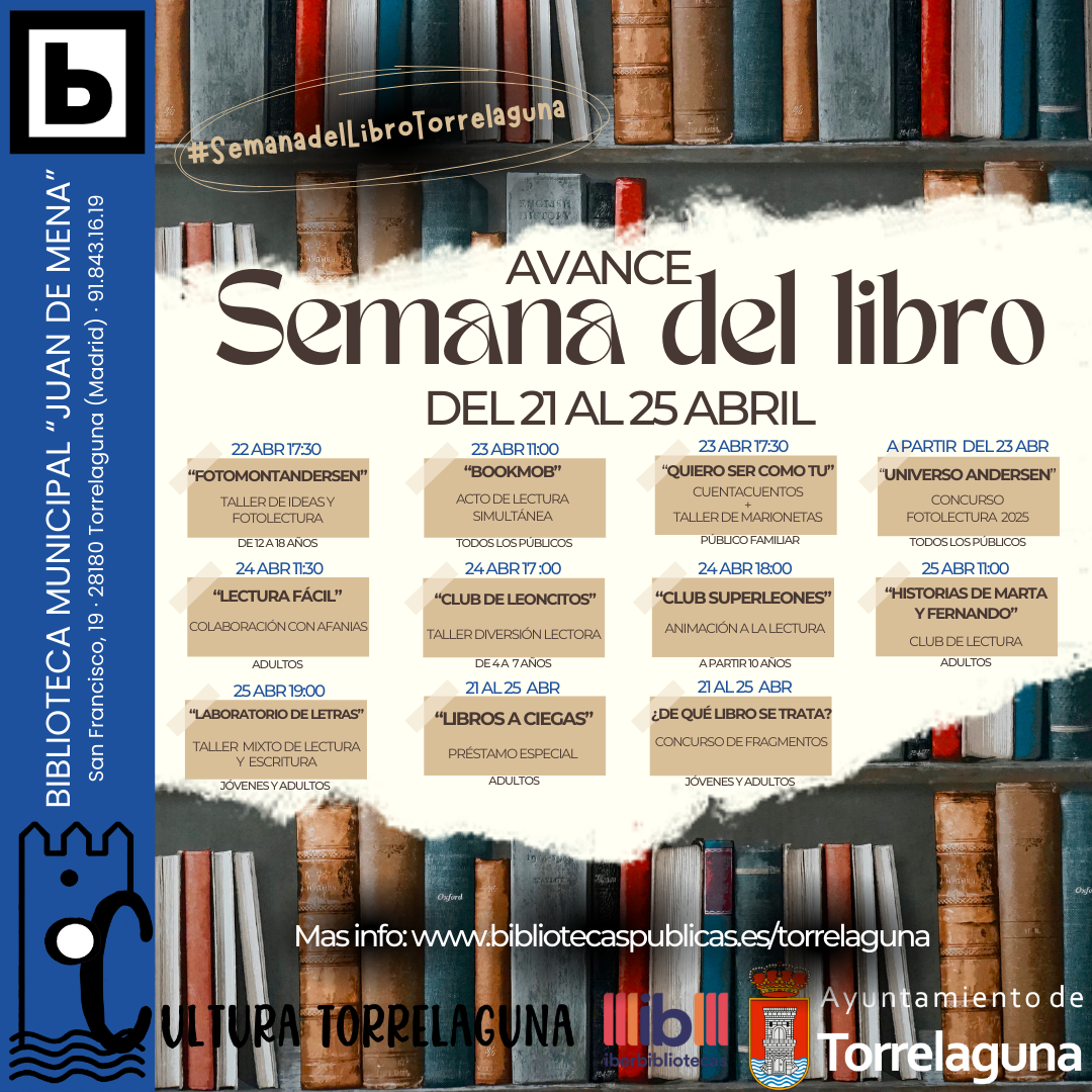 Del 21 al 25 de abril, la Biblioteca Juan de Mena y el Ayuntamiento de Torrelaguna invitan a la ciudadanía a disfrutar de la lectura con motivo del Día Internacional del Libro. Bajo el lema «Disfruta de los libros y la lectura», se ha preparado una semana repleta de actividades gratuitas pensadas para niños, jóvenes y adultos.